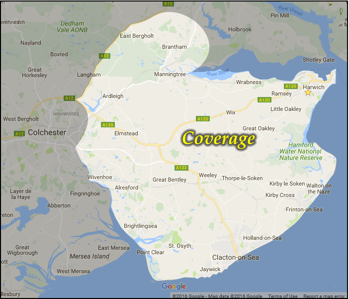 The map below shows the areas we supply cleaning services to, which include Harwich, Ramsey, Wrabness, Little Oakley, Great Oakley, Kirby le Soken, Kirby Cross, Walton on the Naze, Frinton on Sea, Holland on Sea, Clacton on Sea, Jaywick, St. Osyth, Point Clear, Alresford, Wivenhoe, Great Bentley, Weeley, Thorpe le Soken, Tendring, Elmstead Market, Mistley, Manningtree, Lawford and Brantham.